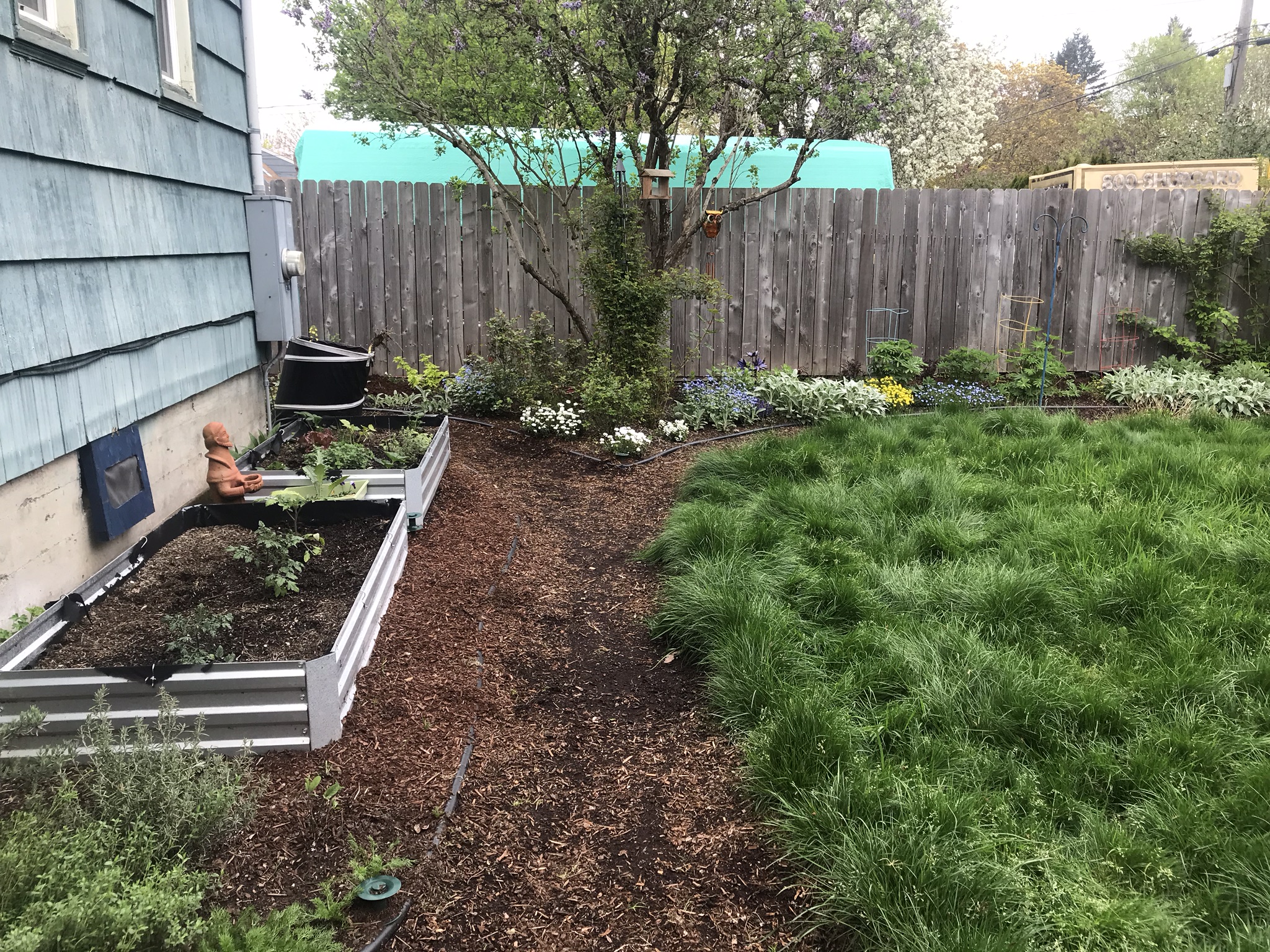 The grass is looking lush and the candytuft, lithodora, Siberian bugloss, and alyssum are filling in. Note that as of May 2020, there is just a single stem, and one single yellow flower, left in the alyssum.